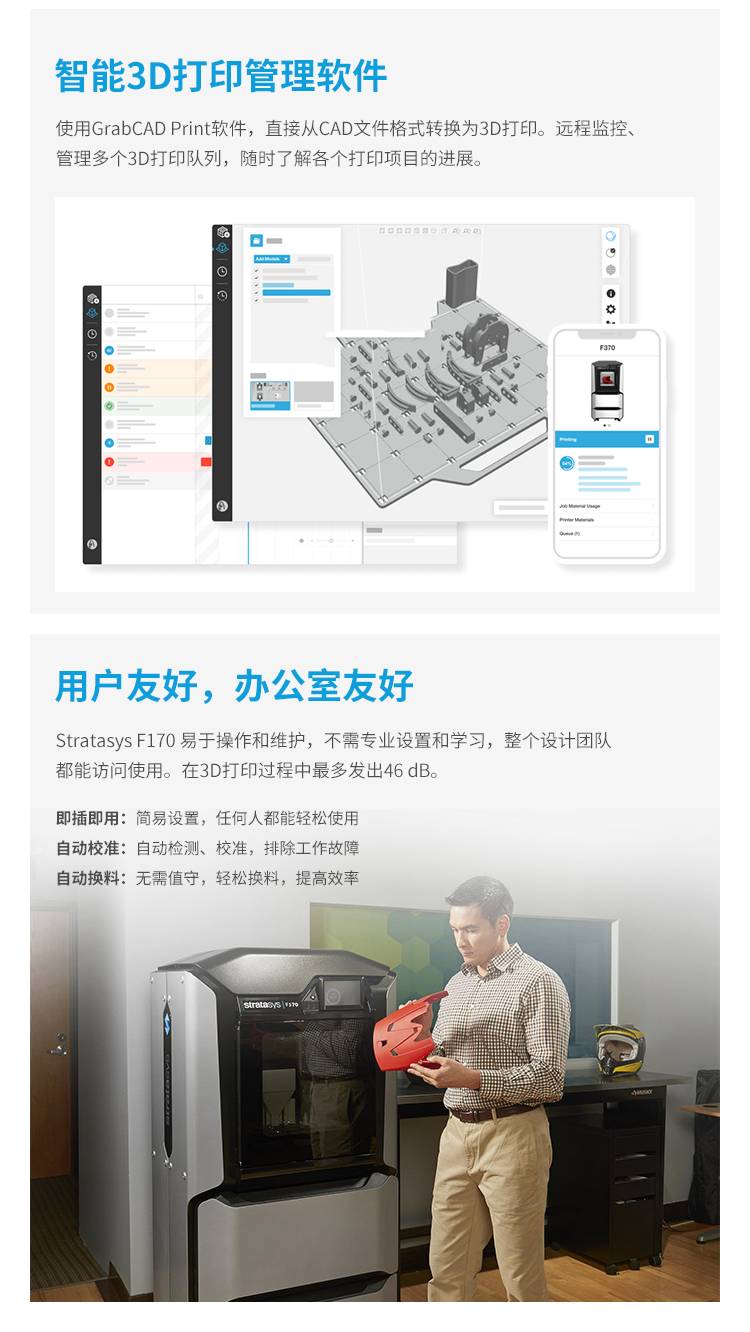 F1233D打印機(jī)專為卓越的易用性而設(shè)計(jì),可以精簡工作流程,并能夠與設(shè)計(jì)端到打印端的GrabCADPrint“軟件無縫銜接。它們強(qiáng)強(qiáng)聯(lián)合,帶來3D打印平臺(tái)優(yōu)化設(shè)計(jì)所需的可靠性和簡易性。該打印機(jī)的清潔、安靜特性和受認(rèn)證的安全性確保整個(gè)工作流程在辦公空間內(nèi)即可完成。
