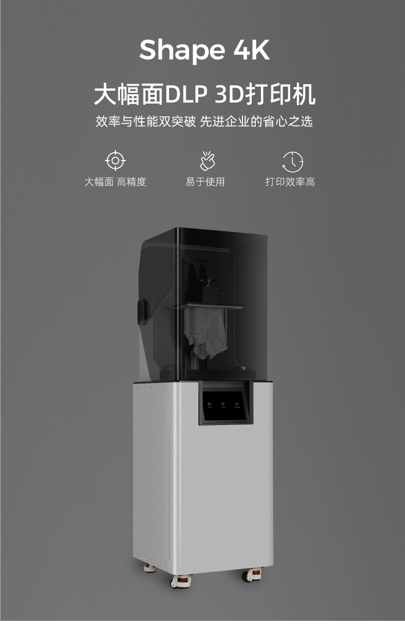 Shape 4K大幅面DLP3D打印機效率與性能雙突破,先進企業的省心之選,更大尺寸,更高精度,405mm光源4k光機帶來高達0.075mm的超高精度,更支持光斑自定。最高打印速度可達50mm/小時,5倍高速于其他同類型產品。